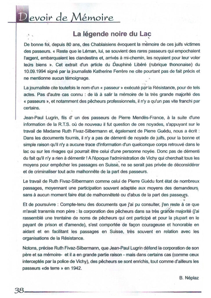 Et il a fallu le travail de recherche de Ruth FIVAZ-SILBERMANN pour faire état de ces passages par le lac Léman. Au terme d’une enquête de 20 ans, R.F-S n’a aucun document, aucun renseignement pouvant éclairer un seul de ces passages criminels.