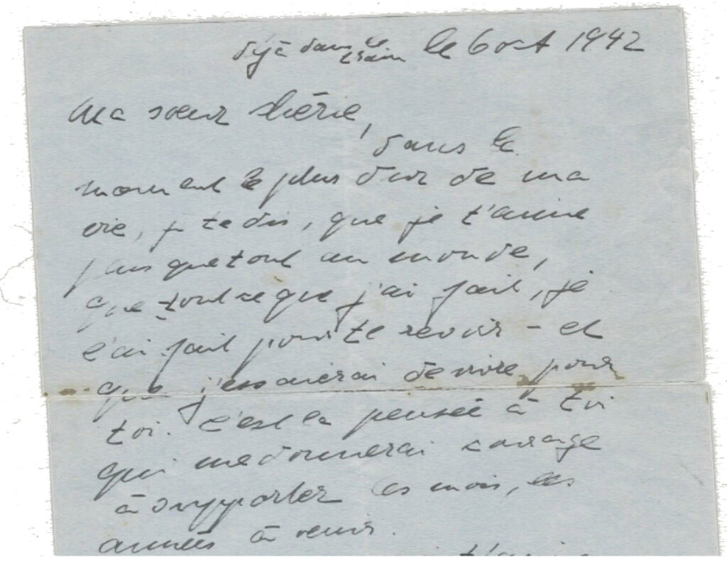 Dans le train qui l’emmène le 6 octobre 1942, sans doute menottée, au camp de Rivesaltes, elle écrit un dernier billet à sa soeur Marie, sa seule famille, qui a réaussi à émigrer aux USA en 1938 avec son mari et ses enfants.